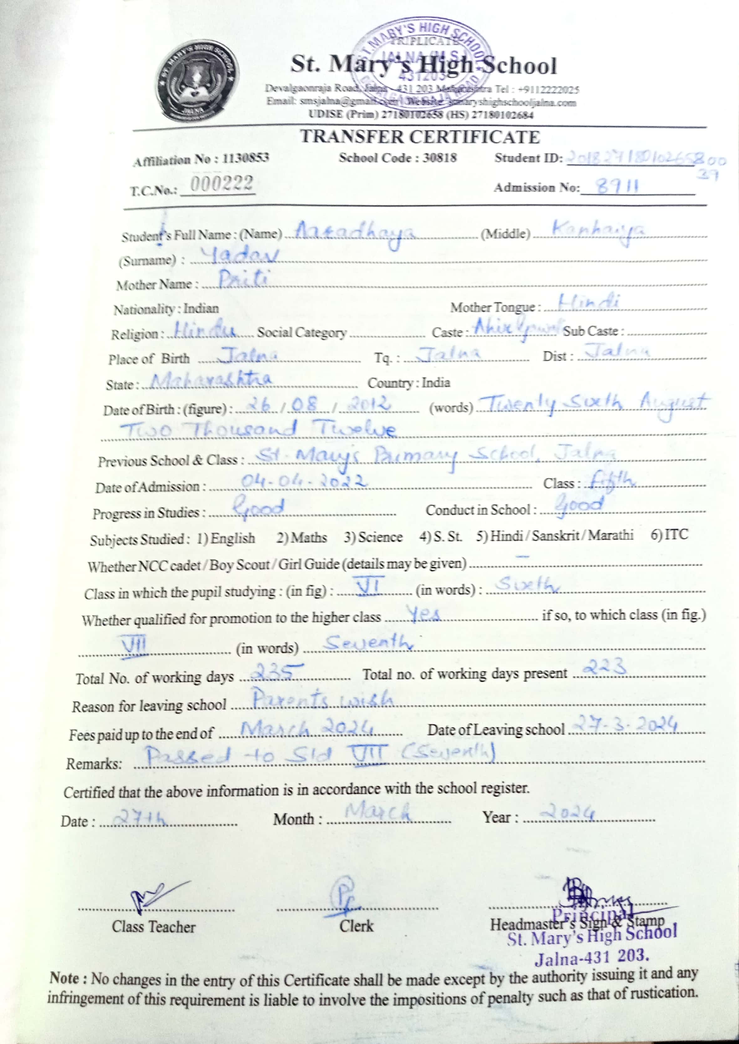 Transfer Certificate of Abhiraj Sanjay Jadhav (9596)
