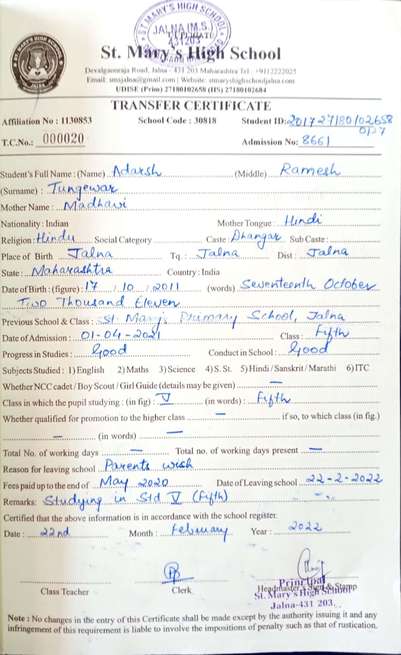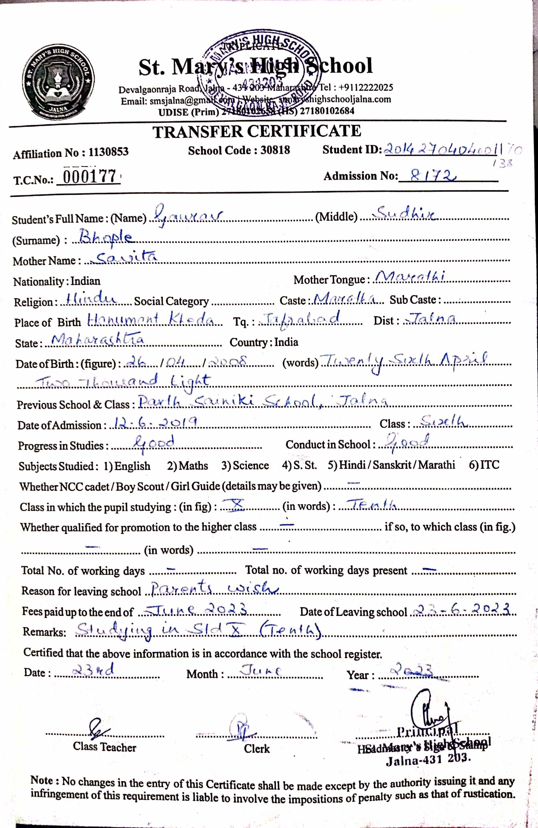 Transfer Certificate of Samarth Bhagwat Ugalmugale (8666)