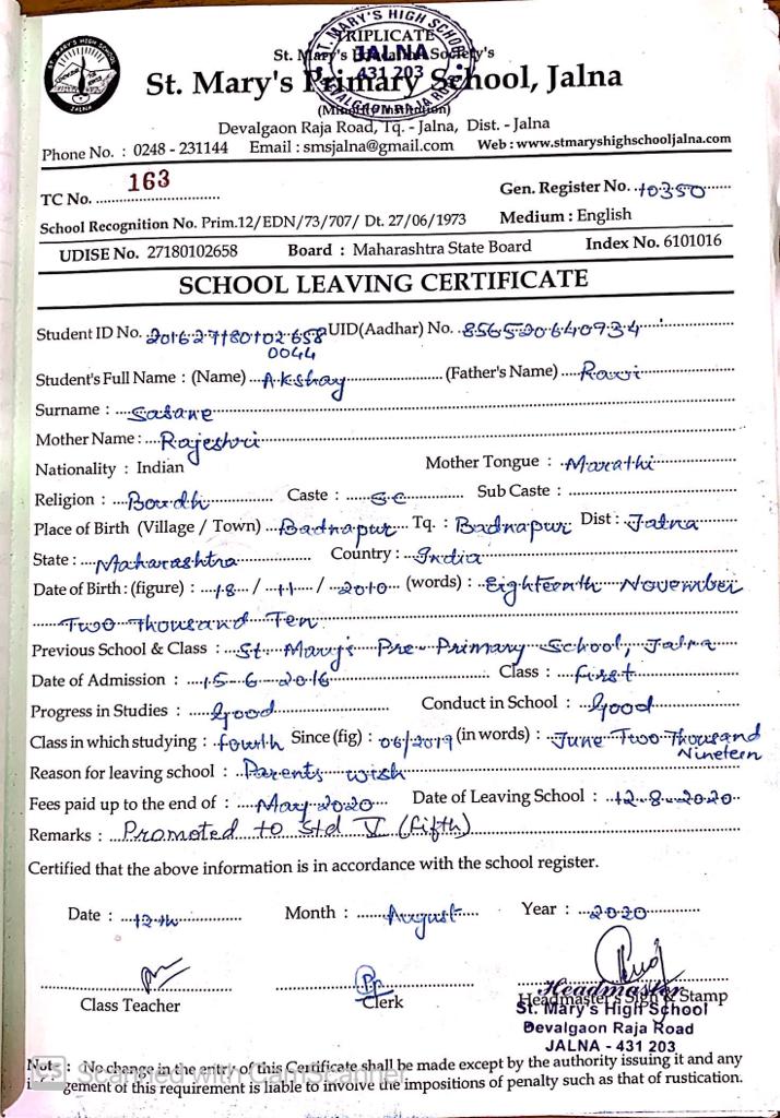 Transfer Certificate of Shlok Rahul Gaikwad (11774)