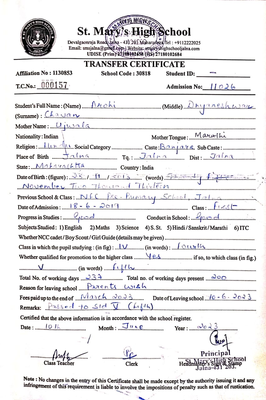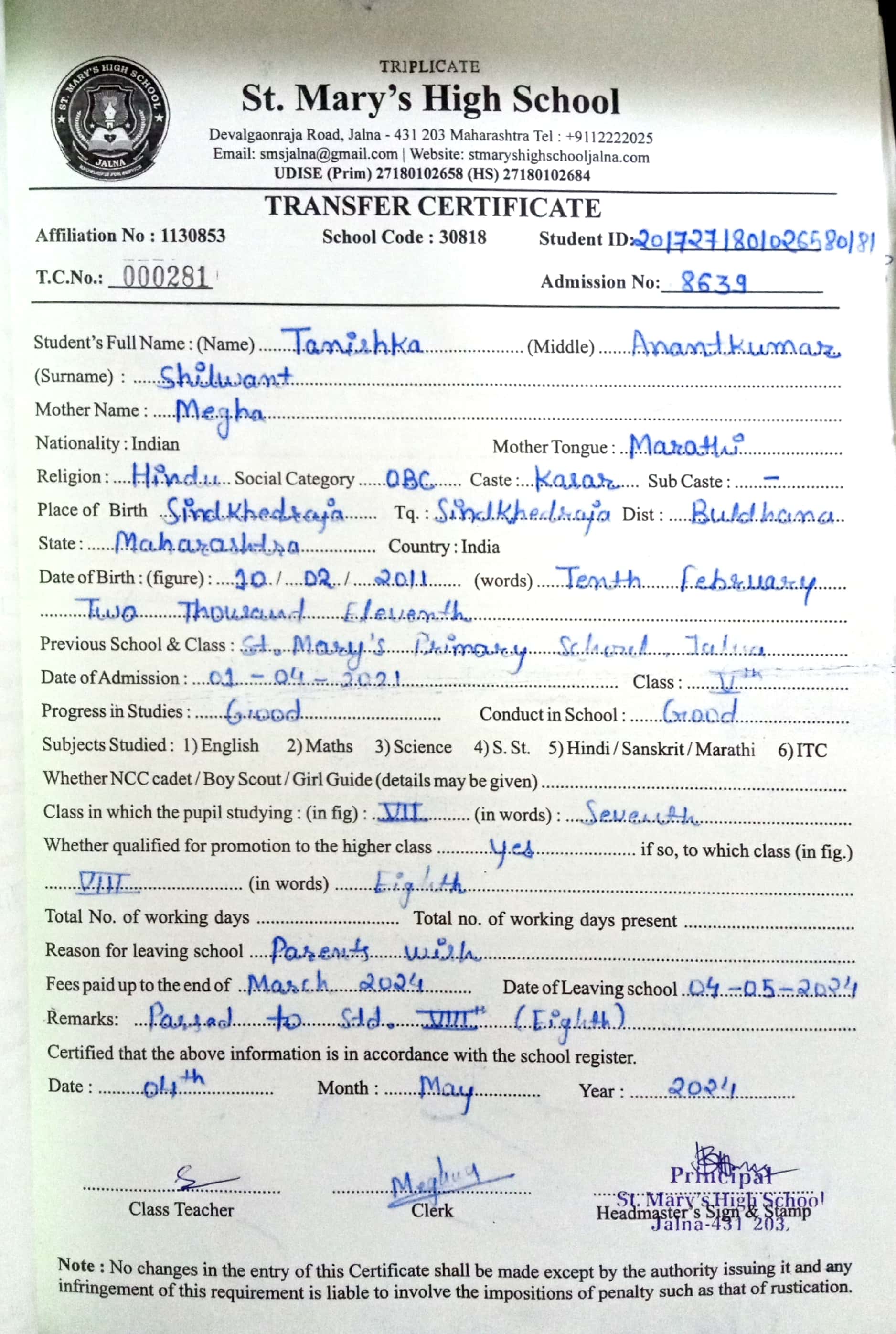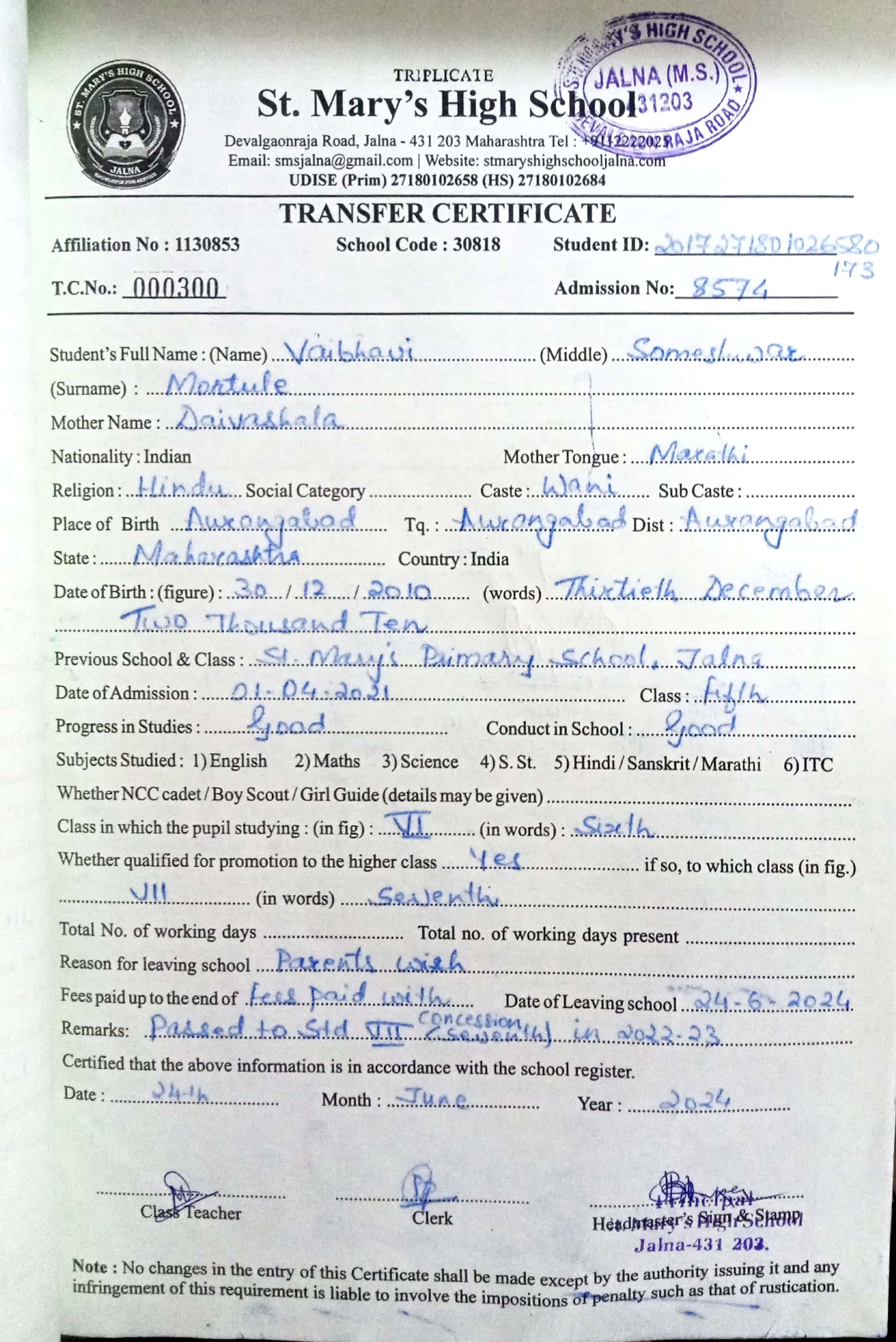 Transfer Certificate of Tanvi Vijay Mhaske (11554)