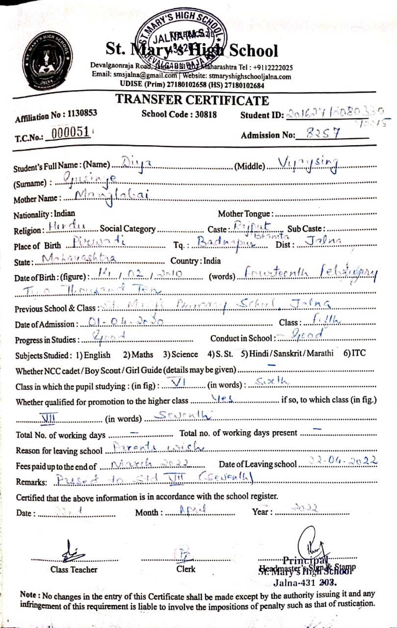 Transfer Certificate of Shloka Sunil Pawar (8994)