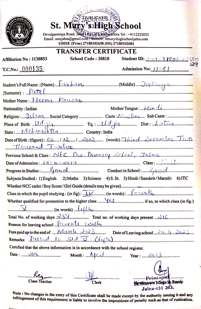 Transfer Certificate of Farhan Jikriya Patel (11151)