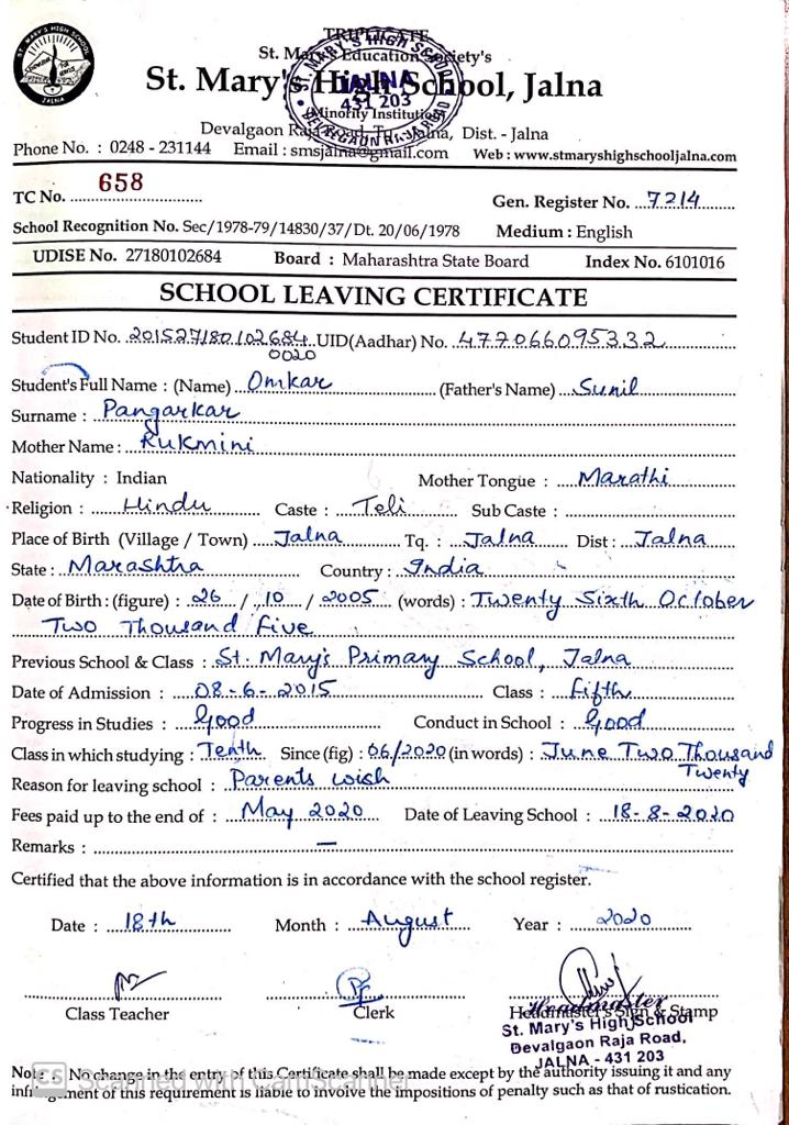 Transfer Certificate of Omkar Kanhayya Sargam (7880)