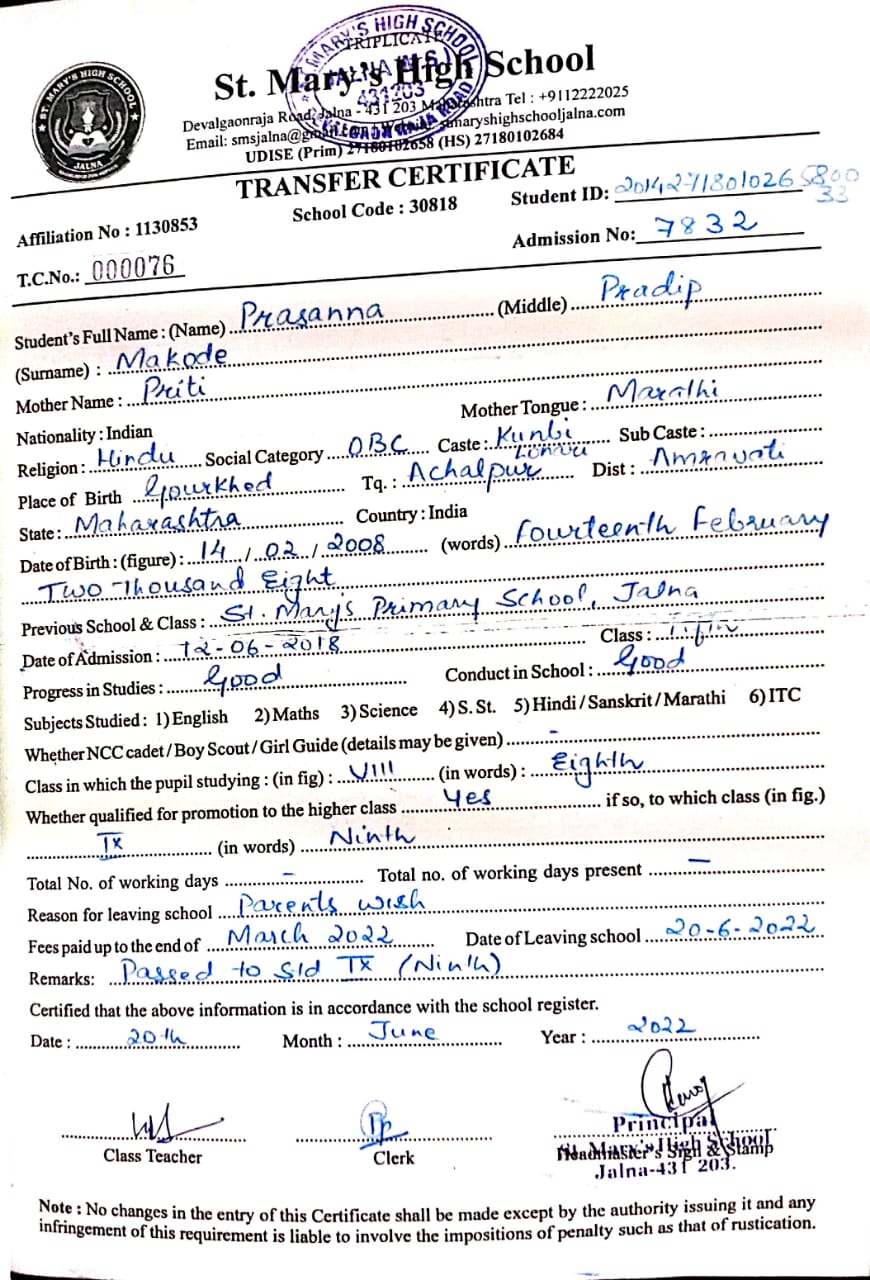 Transfer Certificate of Prasanna Pravin Rathod (8615)
