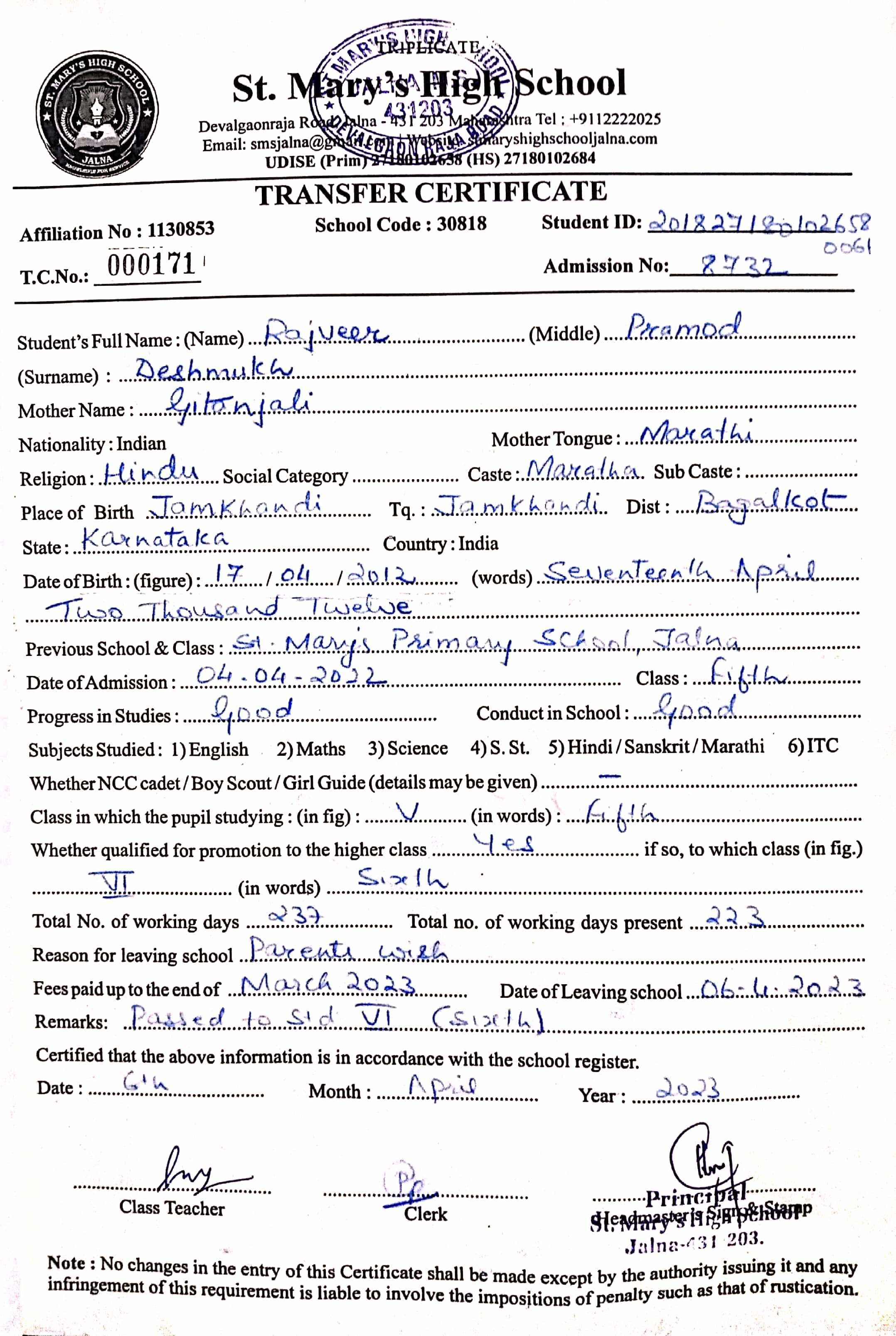 Transfer Certificate of Rajveer Pramod Deshmukh (8732)