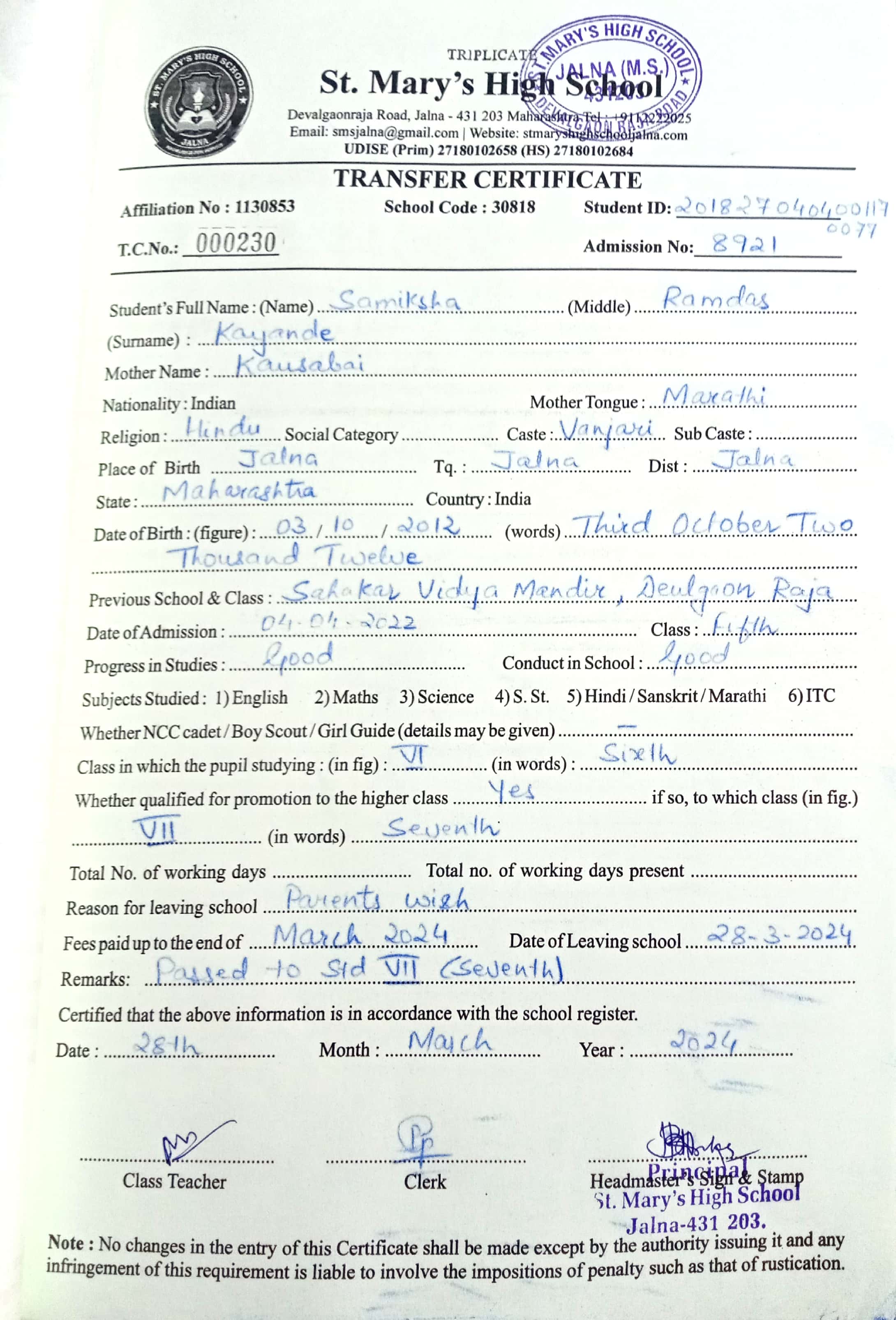 Transfer Certificate of Samiksha Ramdas Kayande (8921)