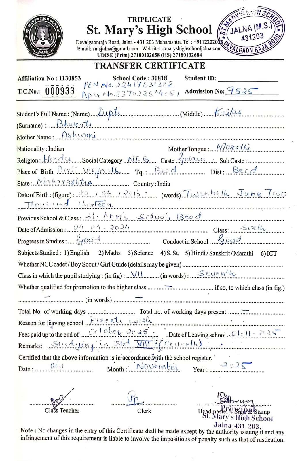 Transfer Certificate of Dipti Bharati Kailas (9525)