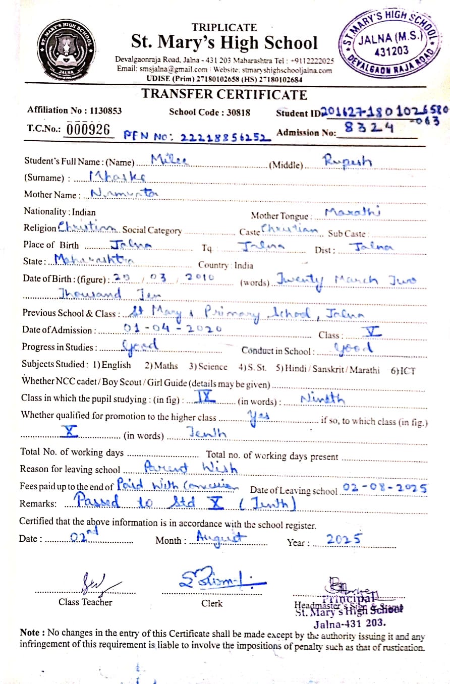Transfer Certificate of Milee Rupesh Mhaske (8324)