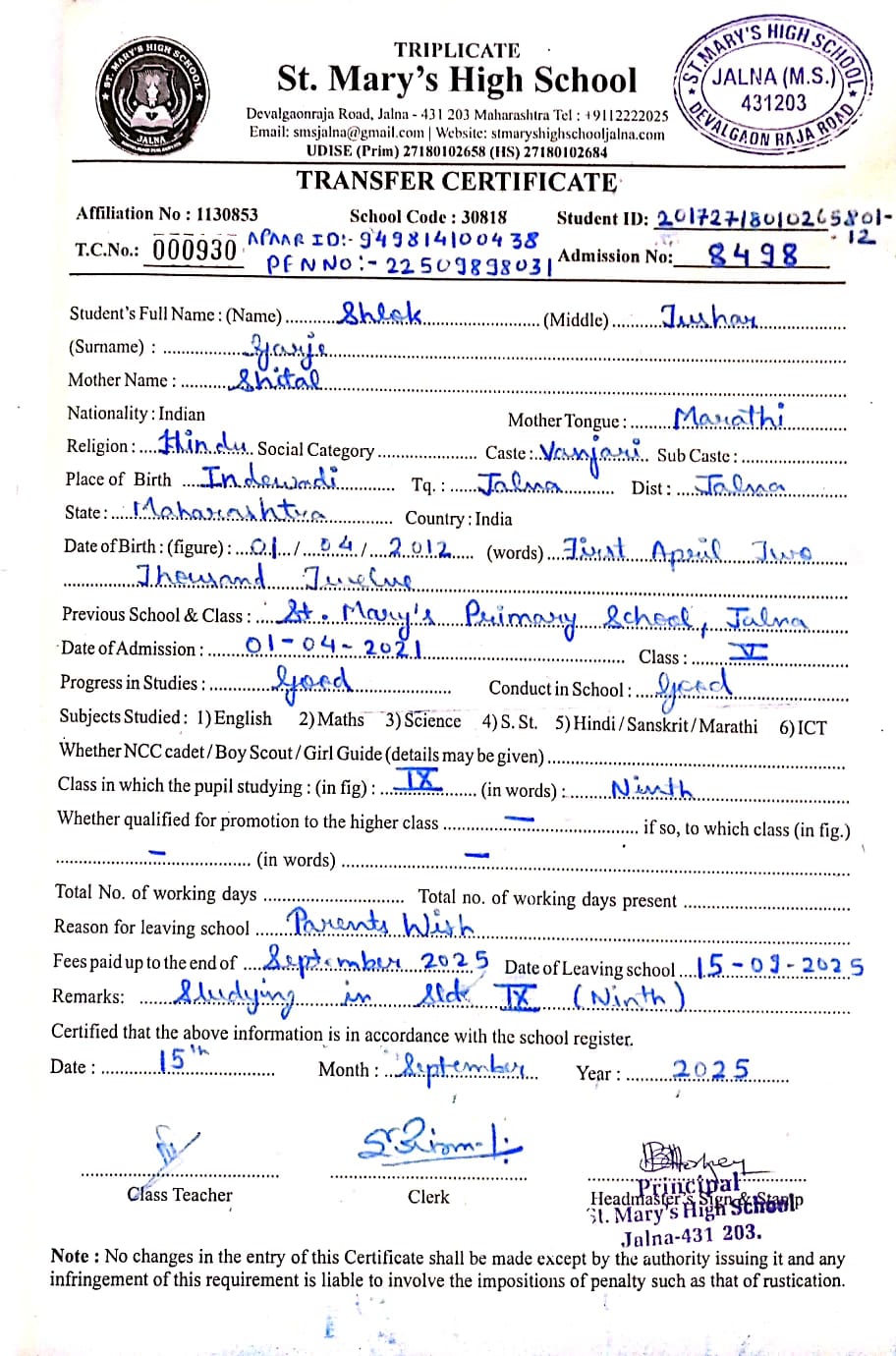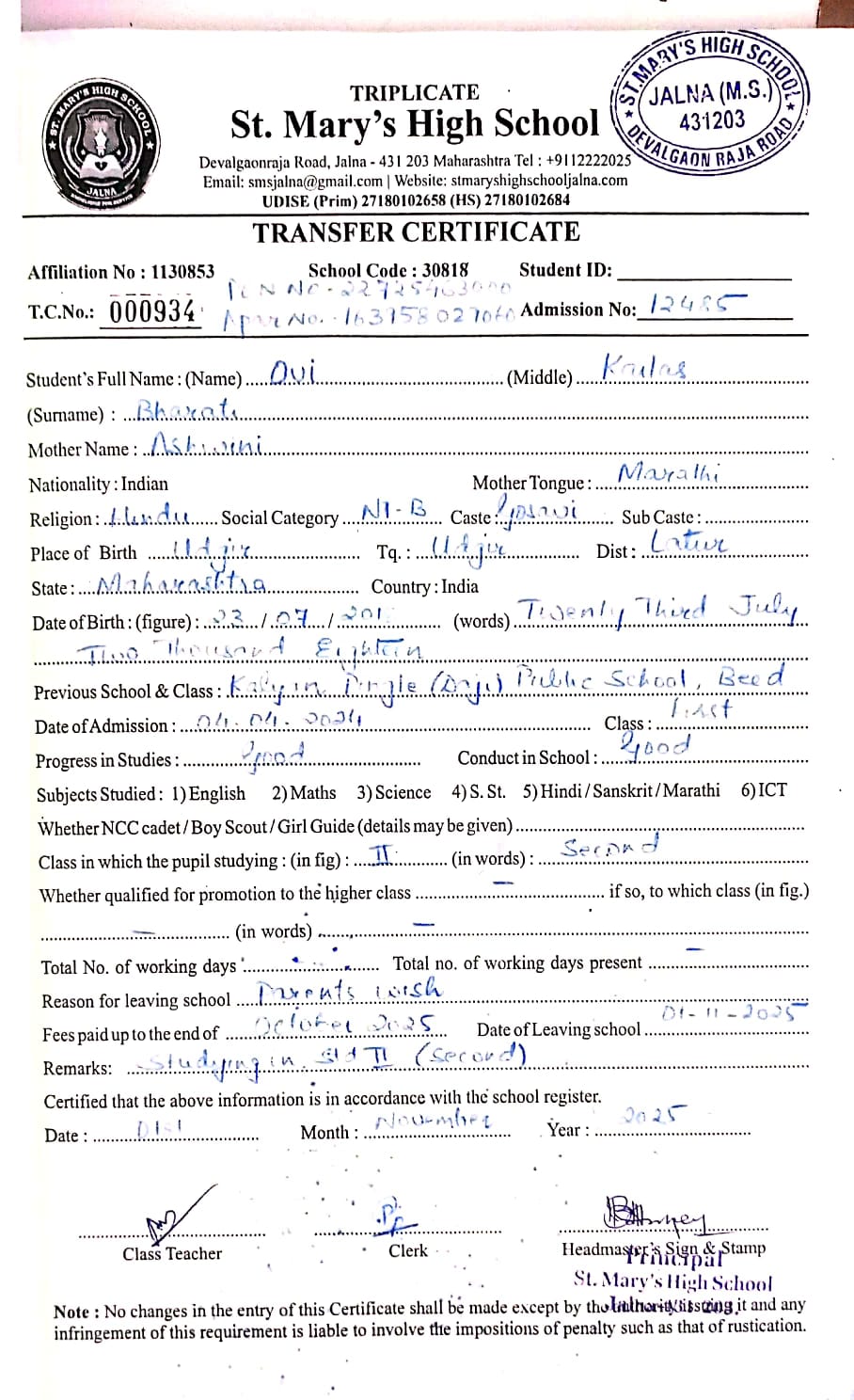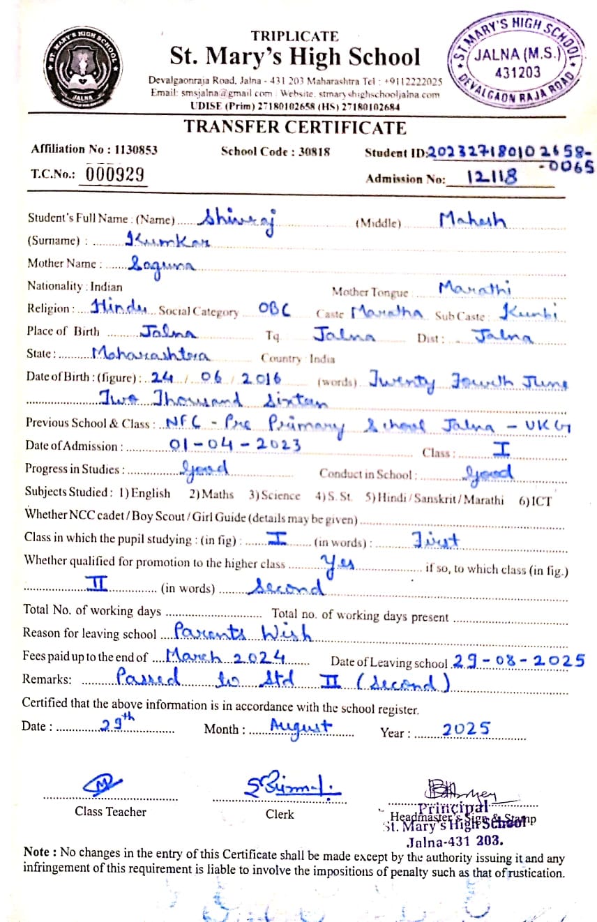 Transfer Certificate of Shlok Rahul Gaikwad (11774)
