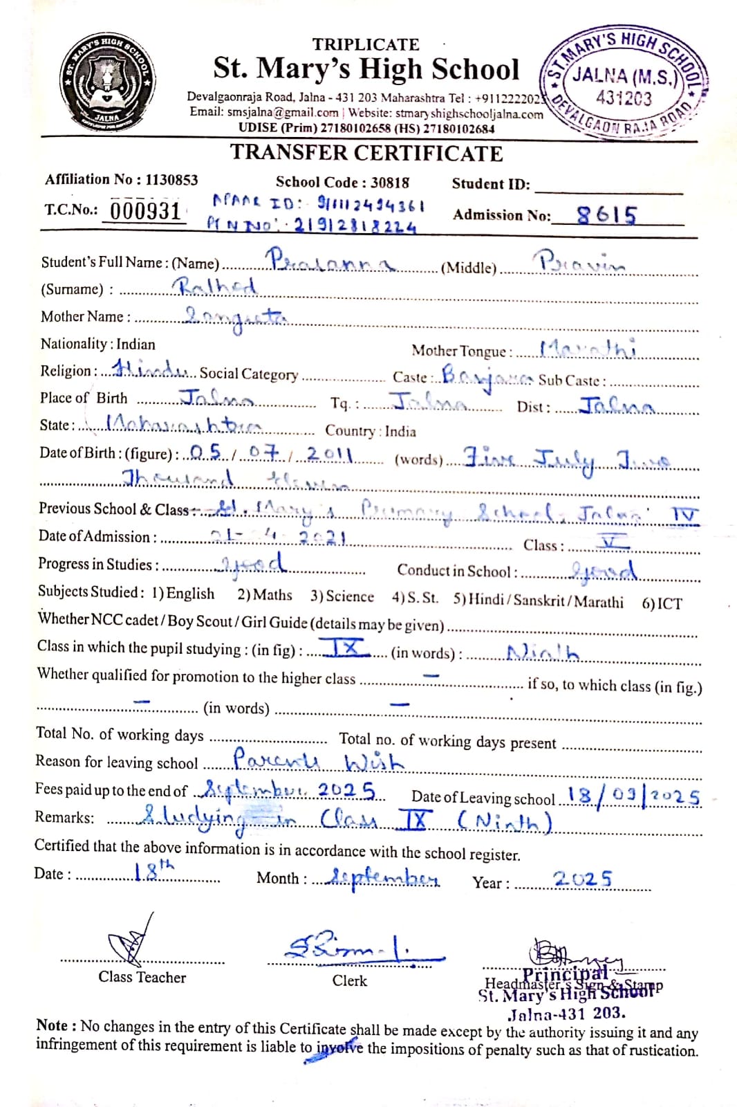 Transfer Certificate of Prasanna Pravin Rathod (8615)