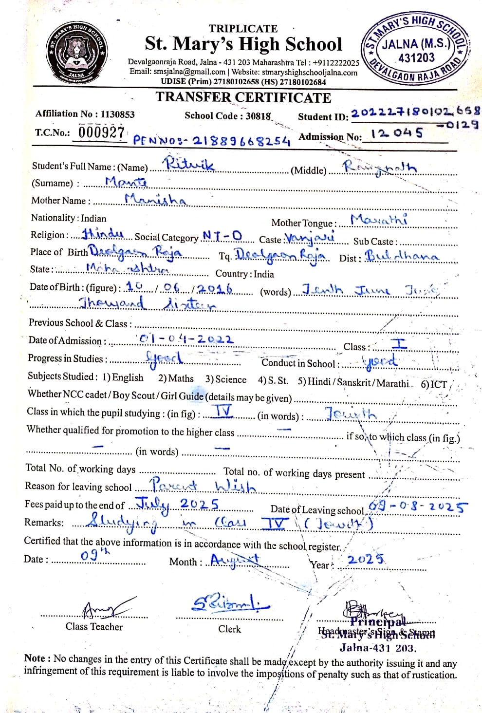 Transfer Certificate of Abhiraj Sanjay Jadhav (9596)