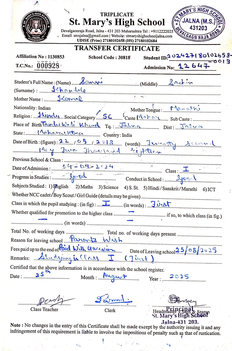 Transfer Certificate of Sanvi Sachin Khandale (12647)