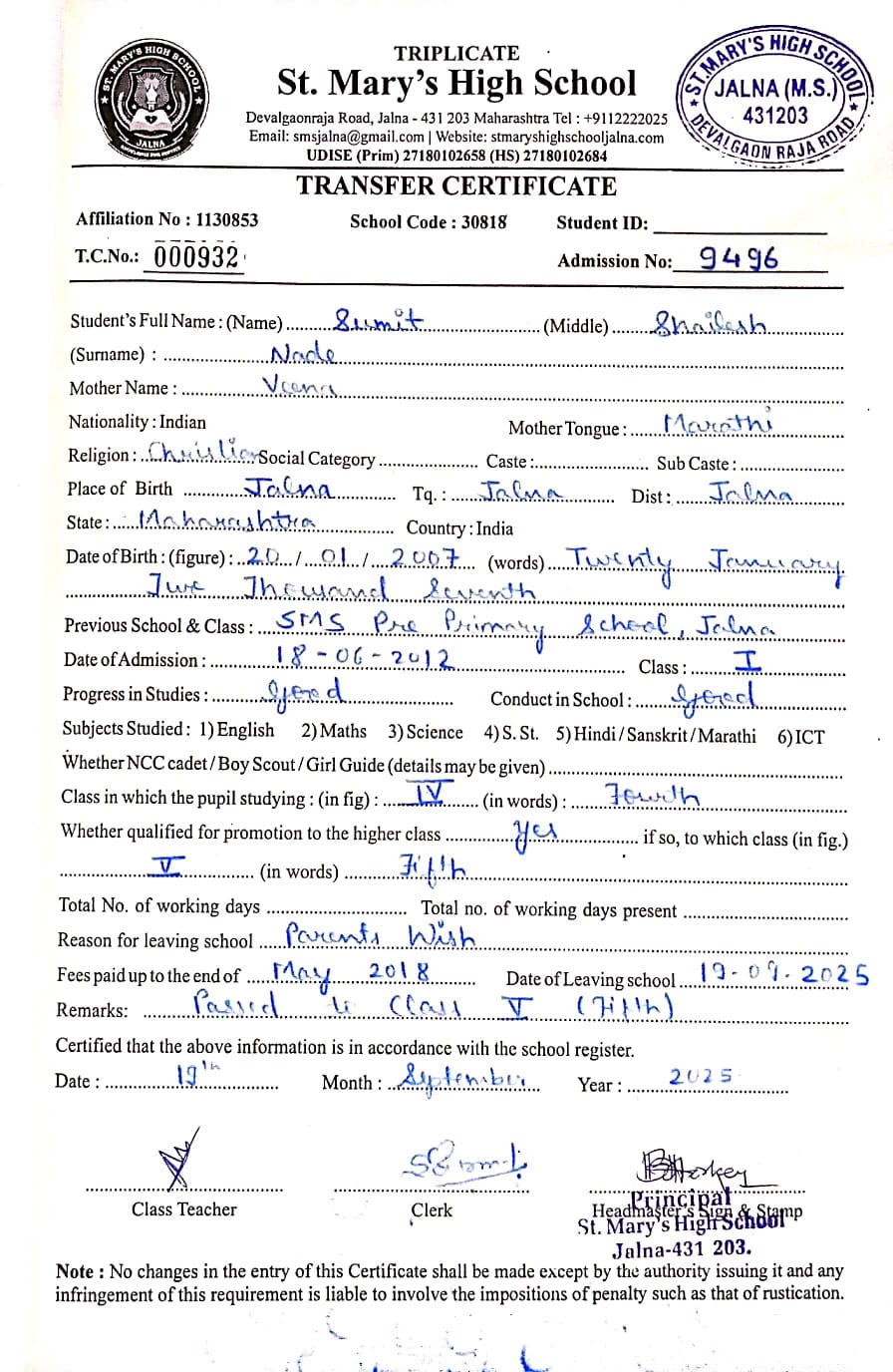 Transfer Certificate of Sumat Shailesh Nade (9496)
